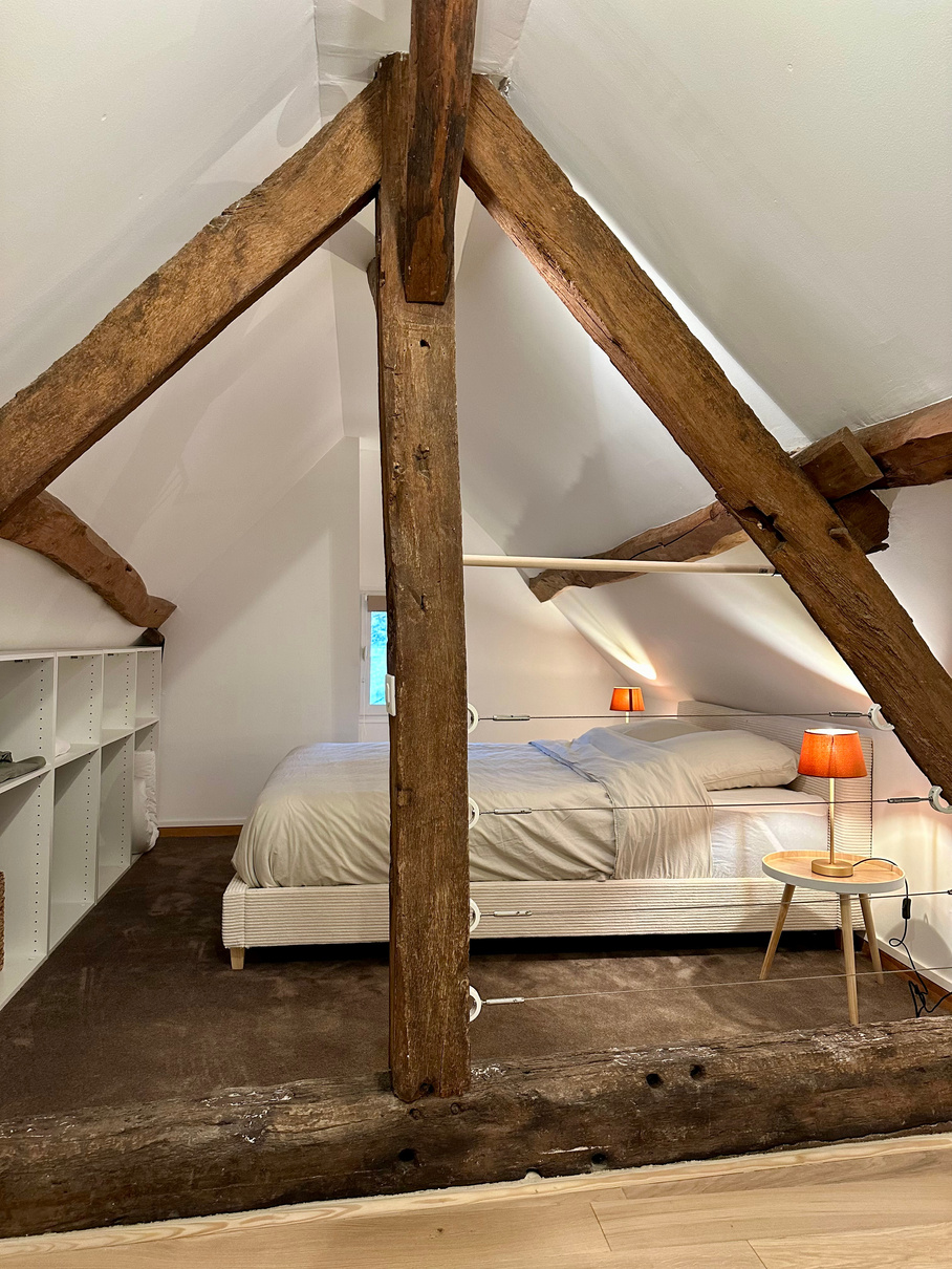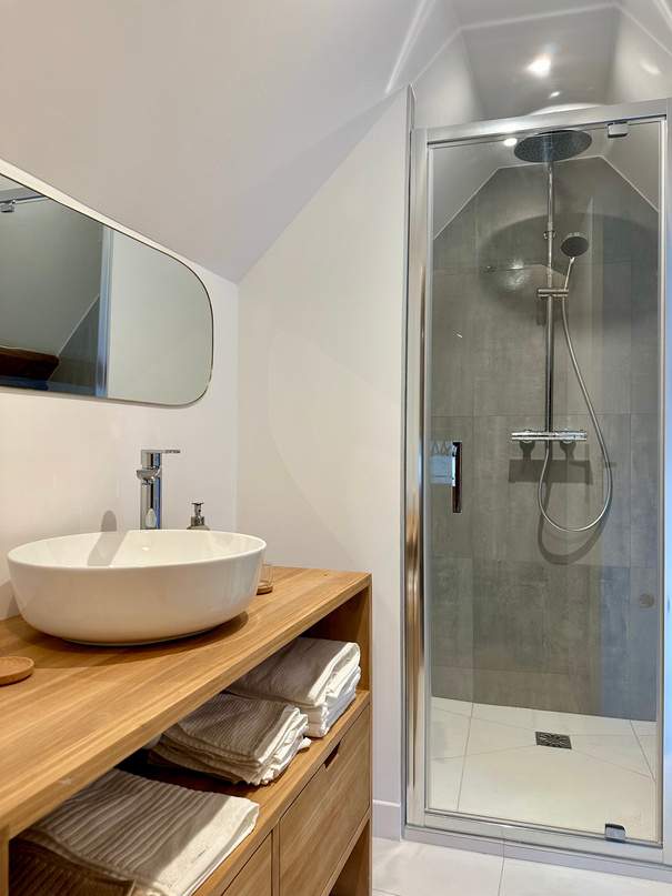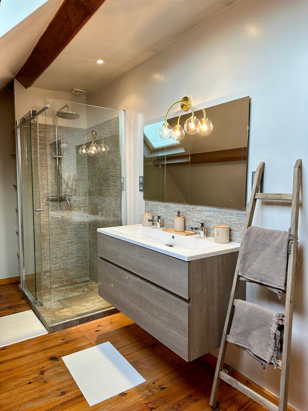A l’étage sous la vielle charpente en chêne vous trouverez une très jolie chambre avec un lit de 160 x 200 (literie de qualité), des placards et penderie ainsi qu’une salle de bains avec une grande douche à l’italienne.